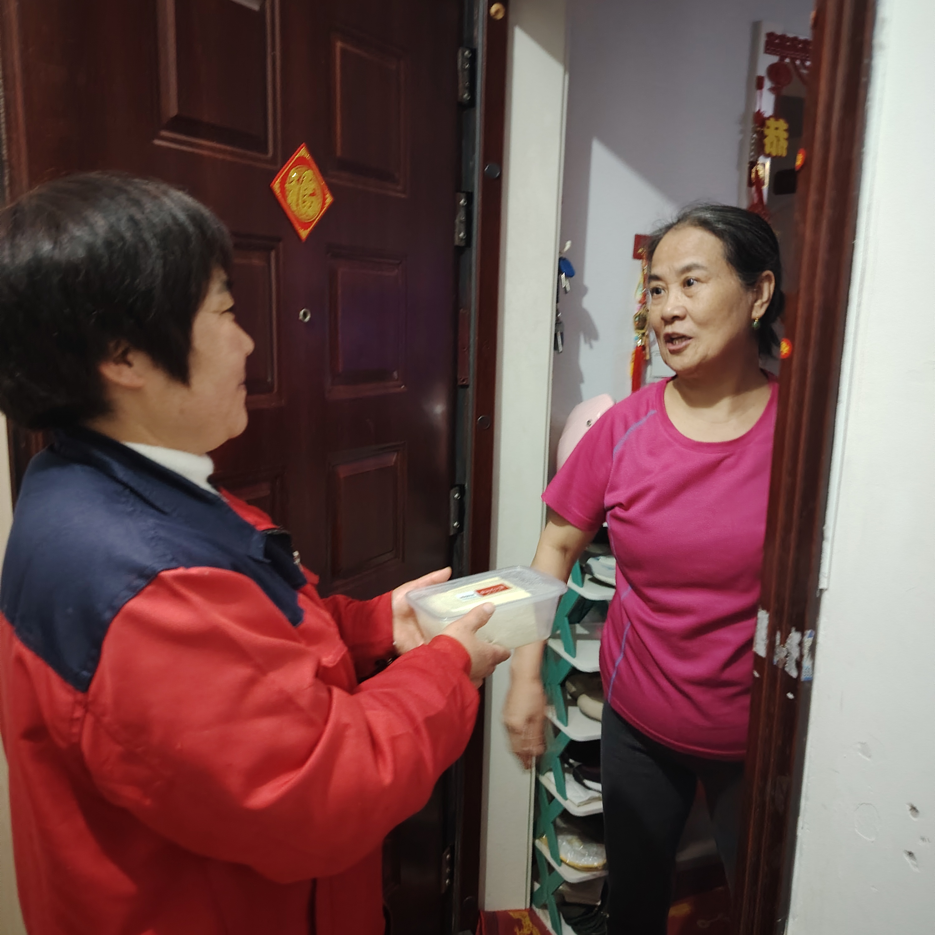 豆腐做好后,物业工作人员细心分装逐户送到老人家中,在送上豆腐的同时,物业工作人员会关切询问老人的近况,聊聊家常,并主动查看家中是否存在需要协助处理的生活细节。